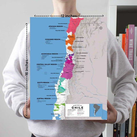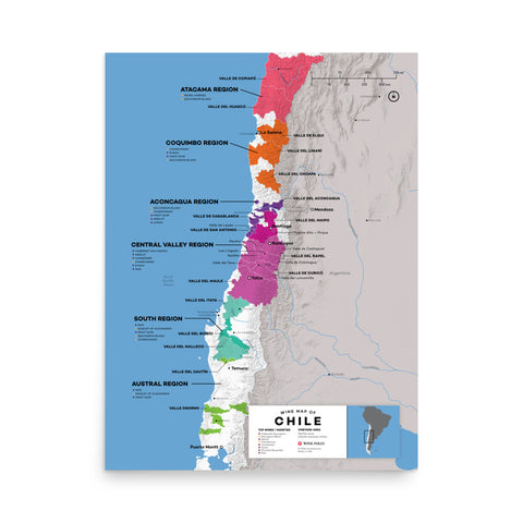This updated map takes you from the arid north to the windswept south, revealing how Chile’s geography, from cool Pacific coasts to sun-drenched Andean valleys, creates ideal conditions for a range of wine styles. Discover crisp Sauvignon Blanc from Casablanca, elegant Pinot Noir from coastal Leyda, and bold reds like Cabernet Sauvignon and Carménère from the inland Maipo and Colchagua Valleys.